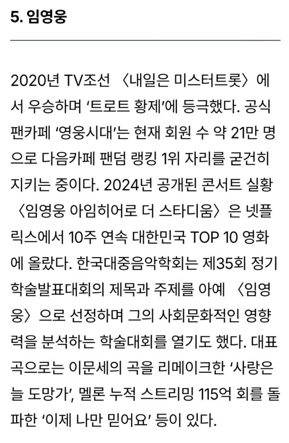 임영웅의 포브스 TOP 5 진입 의미