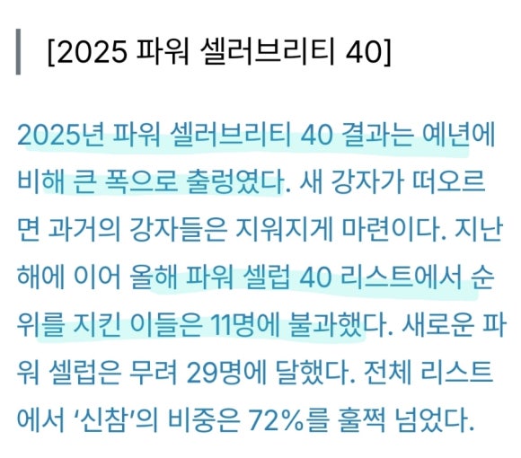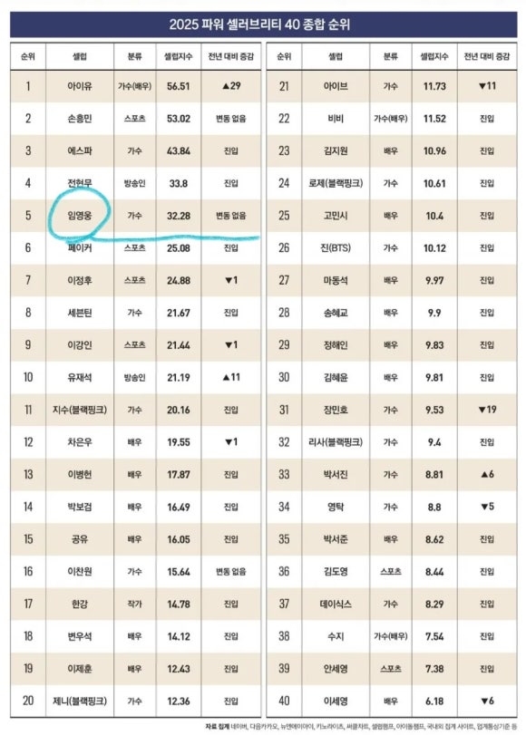 2025년 포브스 코리아가 발표한 ‘파워 셀러브리티 40’ 순위에서 임영웅이 2년 연속 TOP 5에 오르며 다시 한번 대중의 관심을 집중시켰습니다. 특히 SNS 부문에서는 압도적인 언급량으로 1위를 기록하며, 팬덤 ‘영웅시대’의 저력을 증명했습니다. 단순한 가수 그 이상의 브랜드 파워, 지금 그 이유를 함께 분석해보세요!