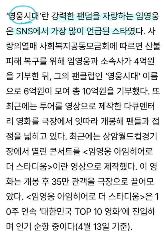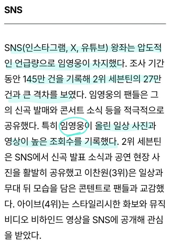 그동안 브랜드 평판 지수에서 SNS 관련 커뮤니티 지수가 약하다고 알려졌던 임영웅. 하지만 이번 포브스 결과는 팬들이 만들어낸 자발적 언급과 콘텐츠가 실제 SNS에서 막강한 파급력을 보이고 있음을 보여줍니다.
